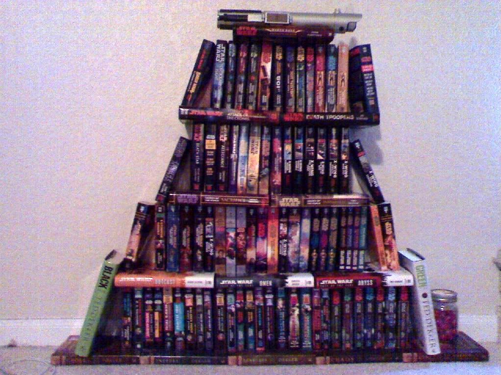 EDIT: Here is what I made this afternoon from all my Star Wars books (and 7 Ted Dekker books plus a jar of atomic fireballs). Its a little off center/leaning... but I don't feel like fixing it because I know once I start messing with it, it'll come crashing down like it did the first 2 times.