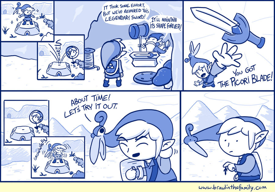 Someone forgot to make the Plot Weapon shrinkable, or in this case, able to retain it's size. =P Even Ezlo's lost for words, too. xD