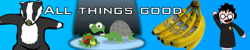 Thanks Jas for my other Banner, now could I get a Banner with, The Nom Turtle, The Badger song Badgers, A Banana phone and the potter pals harry potter, with text that says, "All things good"? I'll pay 15 clicks.