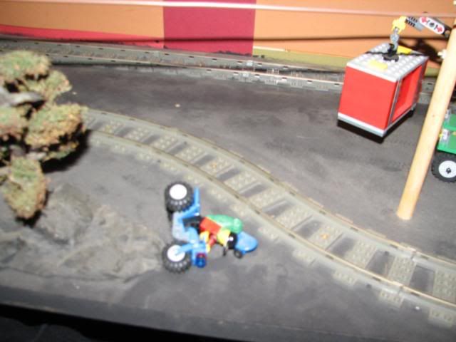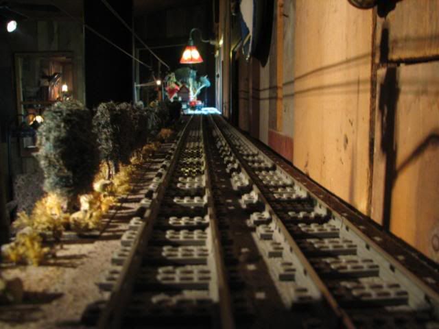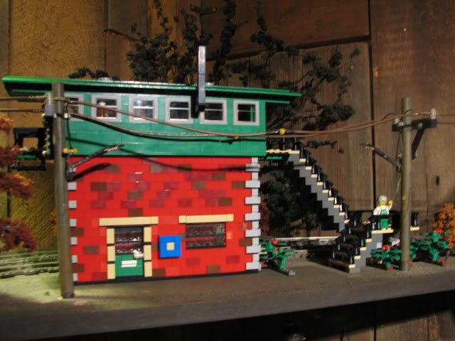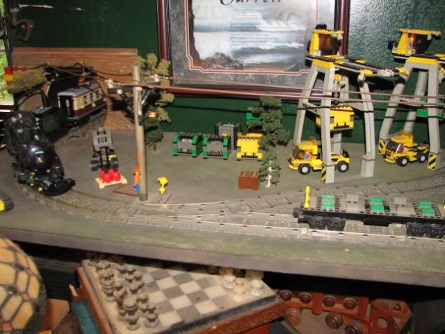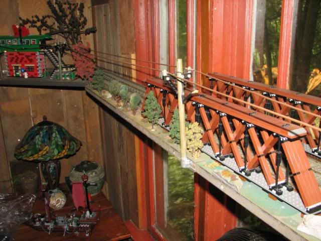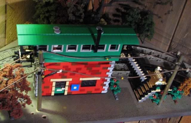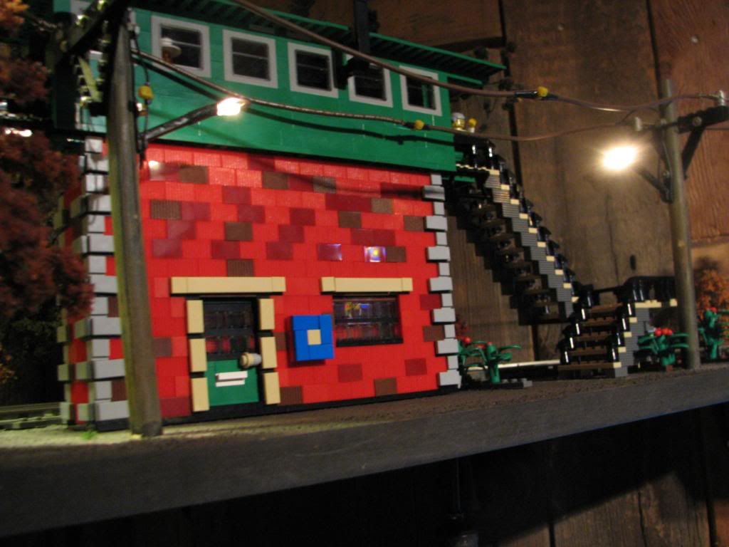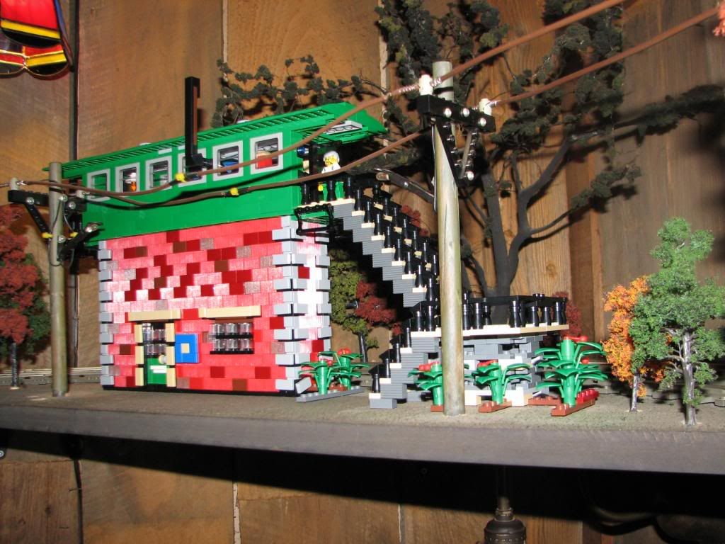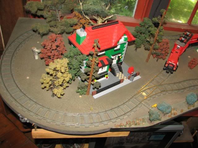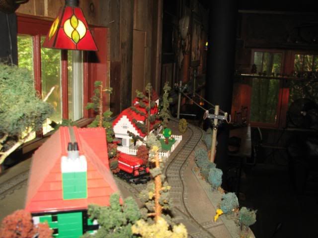 OK, let's finish the layout pictures. We started in the living whaere you see the three houses, the green one btw is the design of JediMaster_Syfodias. A larger shelf area is required to allow the train to loop around and go the other way, thus allowing for continous operation.