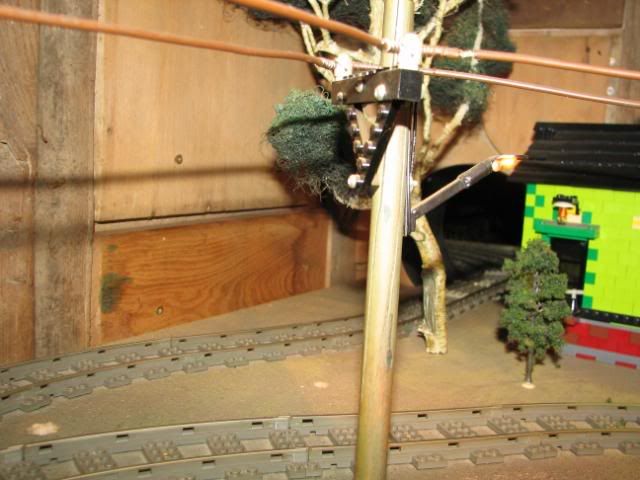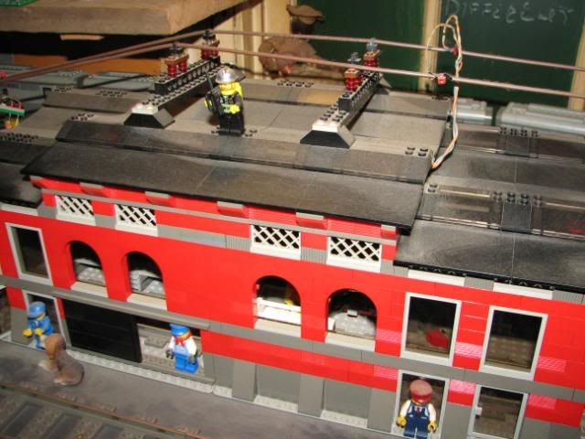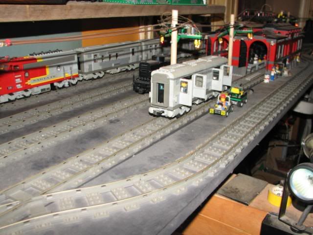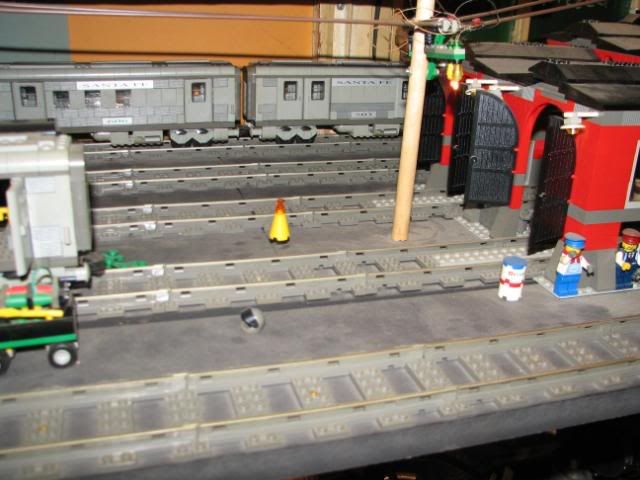 To finish up the layout and moving around the room we come to LEGO's train shed which I bought two of and put them together. You can see at the point of the red train shed that the tracks run 5 wide, 3 in one direction and 2 in the other. A small note on layout, when I built all this the tollerances and distance between tracks and distance between tracks and wall were very tight. I had to do two things when I bought the Emerald Night. One, was to remove the wide pieces at the top front of the engine and I also had to relocate all my hydro poles in the living room area.
